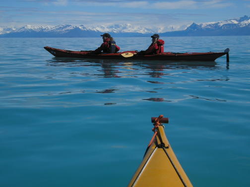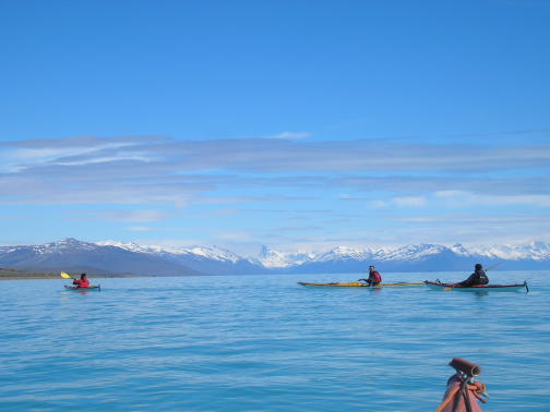 Remando en el Lago Argentino, al Oeste de fondo Los Andes